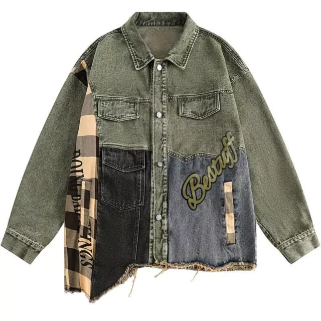 It’s not just a denim jacket; it’s a statement. The hip hop streetwear influence is evident in the striking green and black plaid patchwork, offering a fresh twist on the classic denim look. The washed effect adds a vintage charm, while the loose punk silhouette echoes the freedom and rebellion of street culture. It’s a standout piece that commands attention and celebrates individuality.