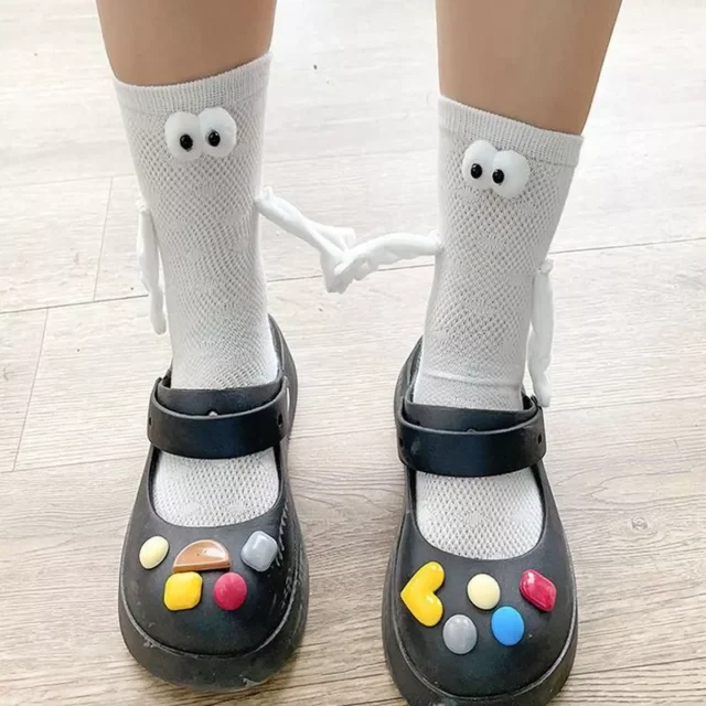 What sets our Magnetic Couple Socks apart is their innovative magnetic feature. Say goodbye to the frustration of lost socks! Our socks come equipped with magnetic suction, ensuring your pairs remain together, always. Their cute and quirky design, featuring cartoon dolls holding hands, adds a sweet touch to your wardrobe. Crafted from breathable polyester, these socks are designed for all-day comfort, making them perfect for any season, especially summer.