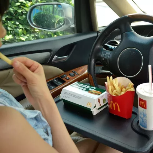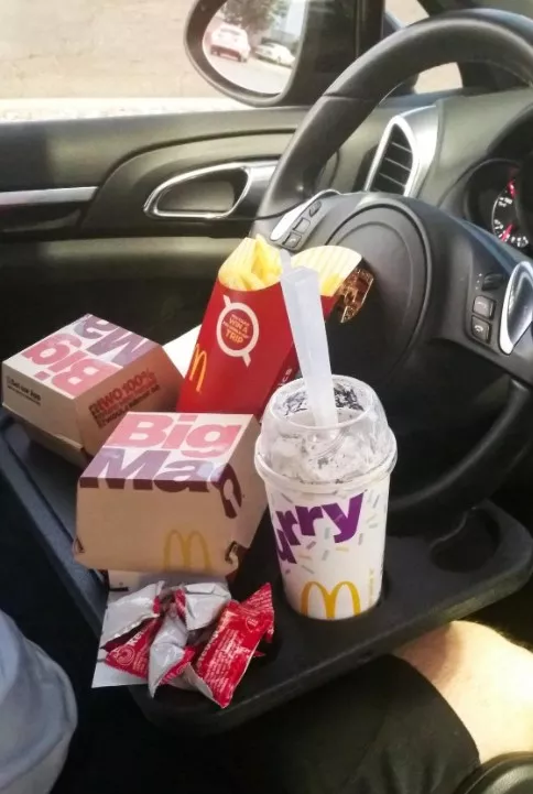 As an outside sales rep I sometimes feel like I live in my car. This dual purpose tray is a 'must have' if you need a well positioned mobile desk or a less awkward way to eat (and avoid wearing) your lunch. It's nice that both sides are functional... a food tray complete with cup holder on one side, and and a smooth flat writing surface on the other. You won't have to worry about getting grease or food residue on your paperwork! Also works well with small laptops or your iPad. Made of high-impact plastic, it won't melt or warp if you leave it sitting in your hot car... virtually indestructible. I can't imagine how I lived without one of these for so many years!