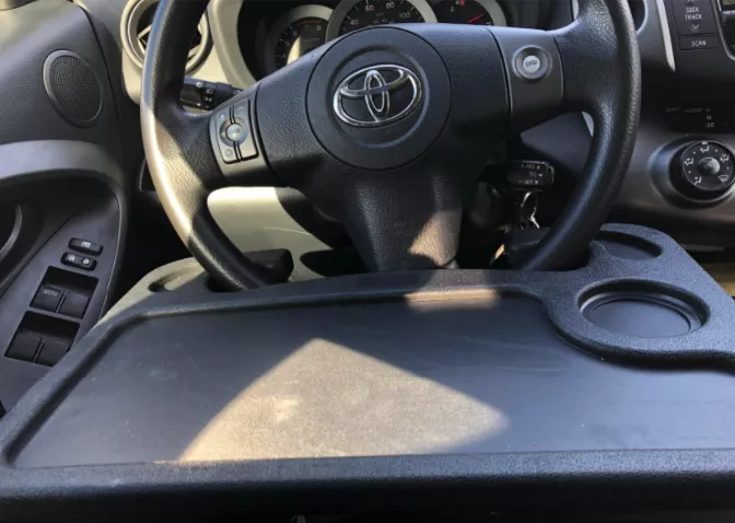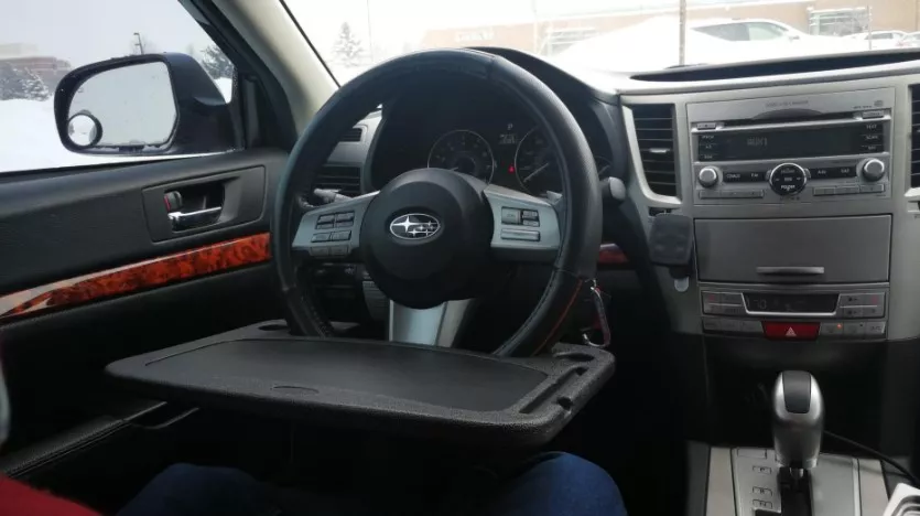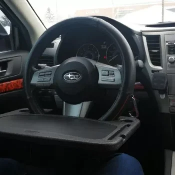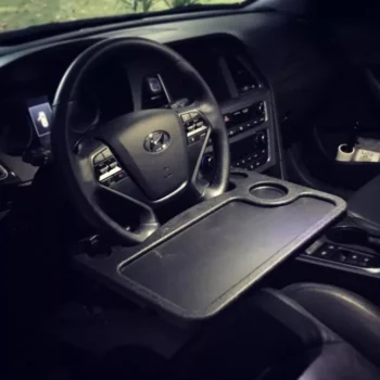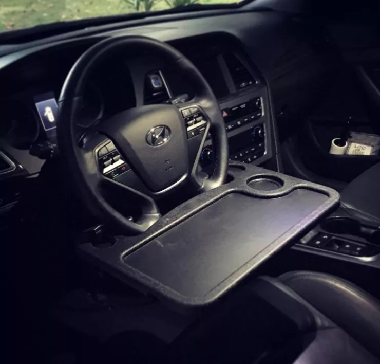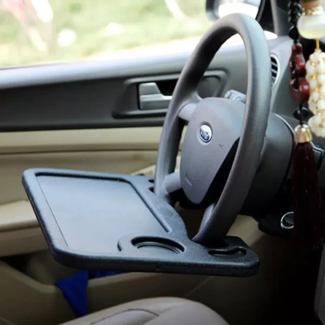 and the steering wheel doesn't have to be turned upside down. This makes the occasional eating in the car much neater. This table, I got the large one, is sturdy and does require a seat adjustment. The flip side has a nice writing surface and a place to secure a pen or pencil. Happy with my purchase. Suggest using this with the engine off if you intend to set your soda on the tray. The combination of power steering and the weight of a full drink on the tray can result in a wet lap. Lol, it hasn't happened yet but I'm just putting it out there