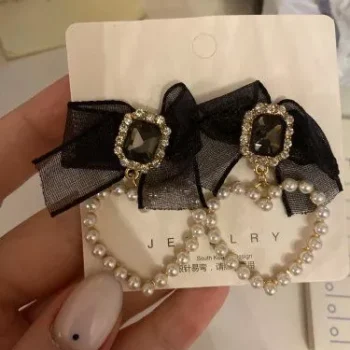 The combination of the S925 needle, black bowknot, and heart-shaped drop with crystal glass and simulated pearls sets these earrings apart. This exquisite mix of materials creates a look that is both classic and on-trend. The high-quality materials ensure that these earrings are not only beautiful but also long-lasting, making them a valuable addition to your jewelry collection.