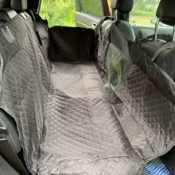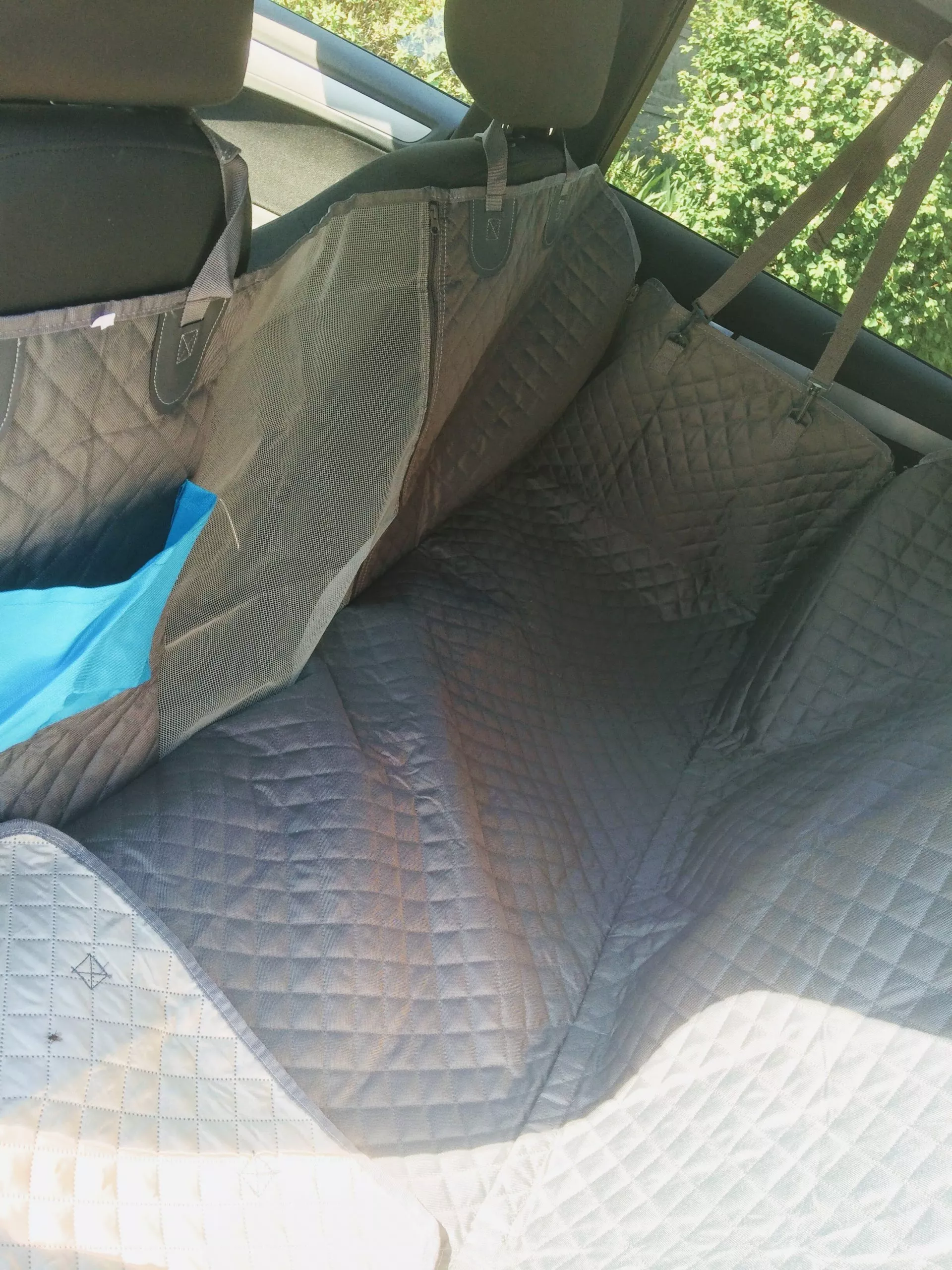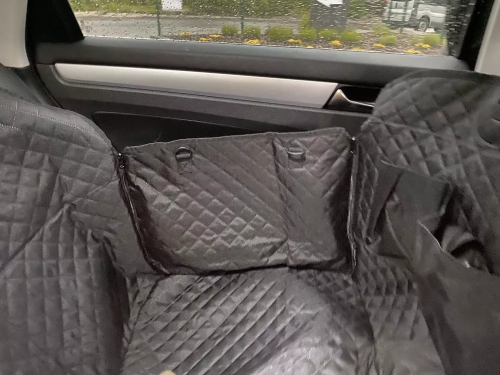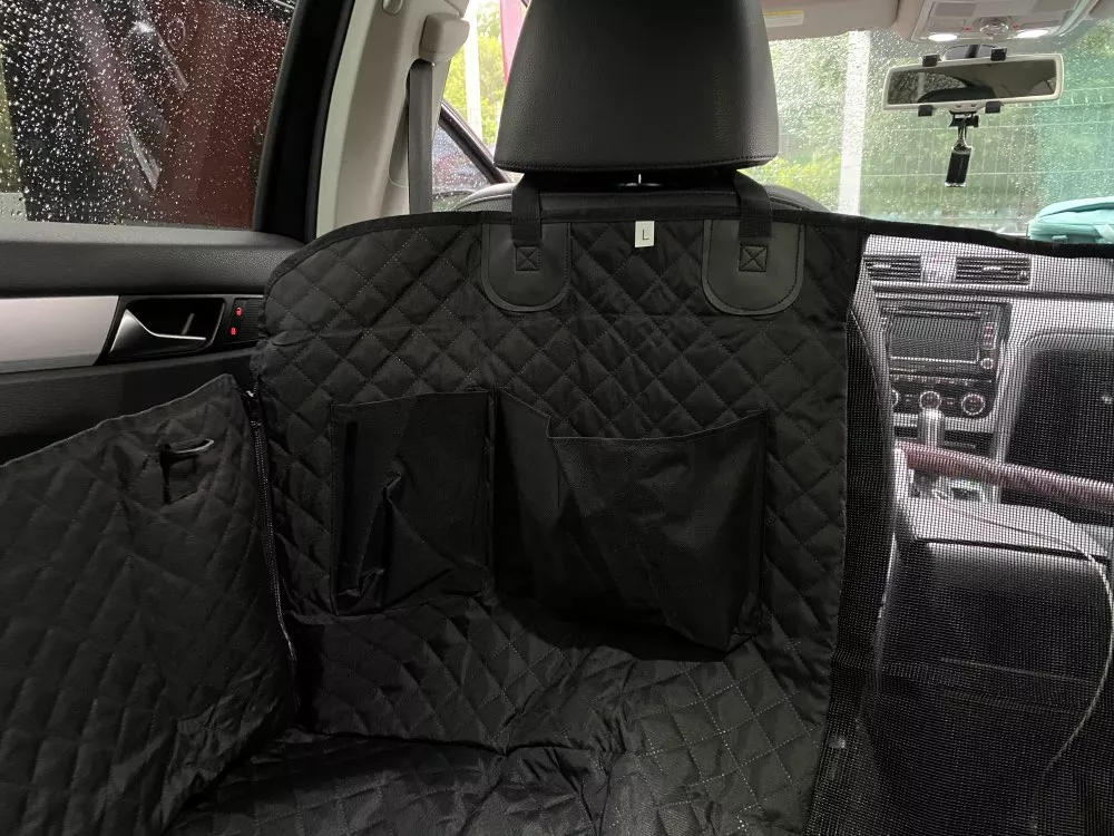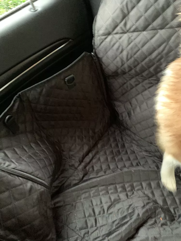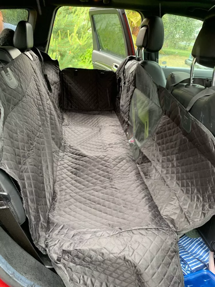 The quality is very good, it has zippers on both sides, so super easy to cover the back seat. Also came with a seatbelt for the pup. The picture is in a jeep grand Cherokee