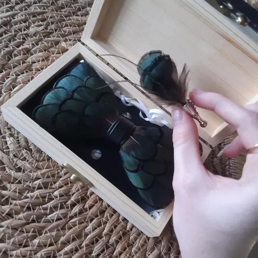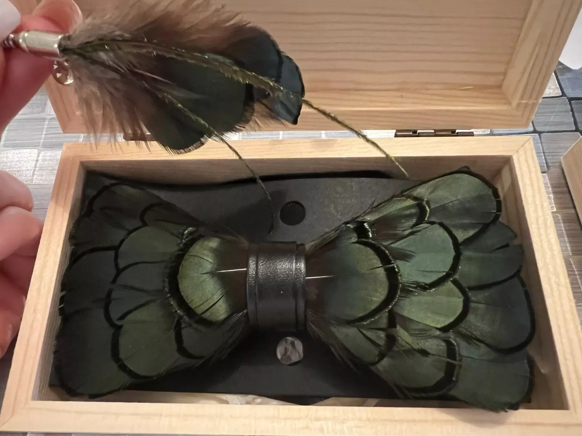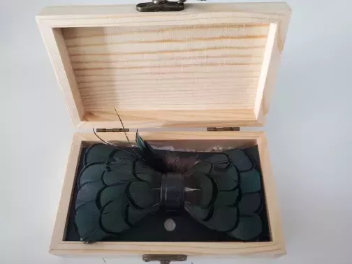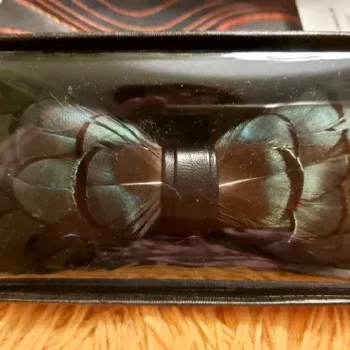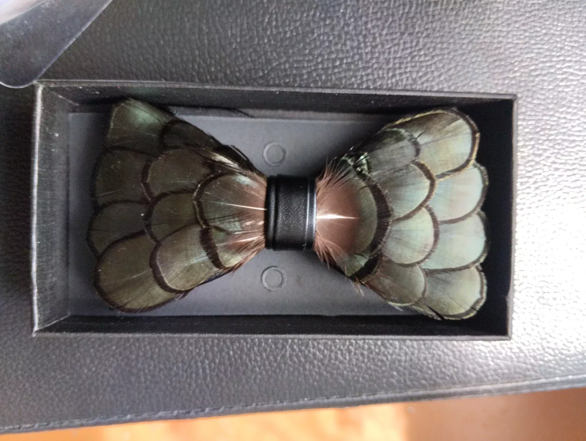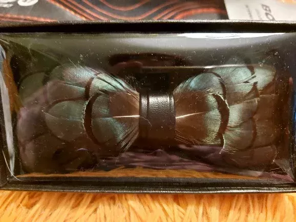 The bow tie is excellent and exactly as described. It came well-packed in a cardboard box and arrived in perfect condition. The natural feathers, from a Diamond pheasant, have a stunning shimmer in different lights. Plus, you can adjust the size of the bow. Definitely worth the money.