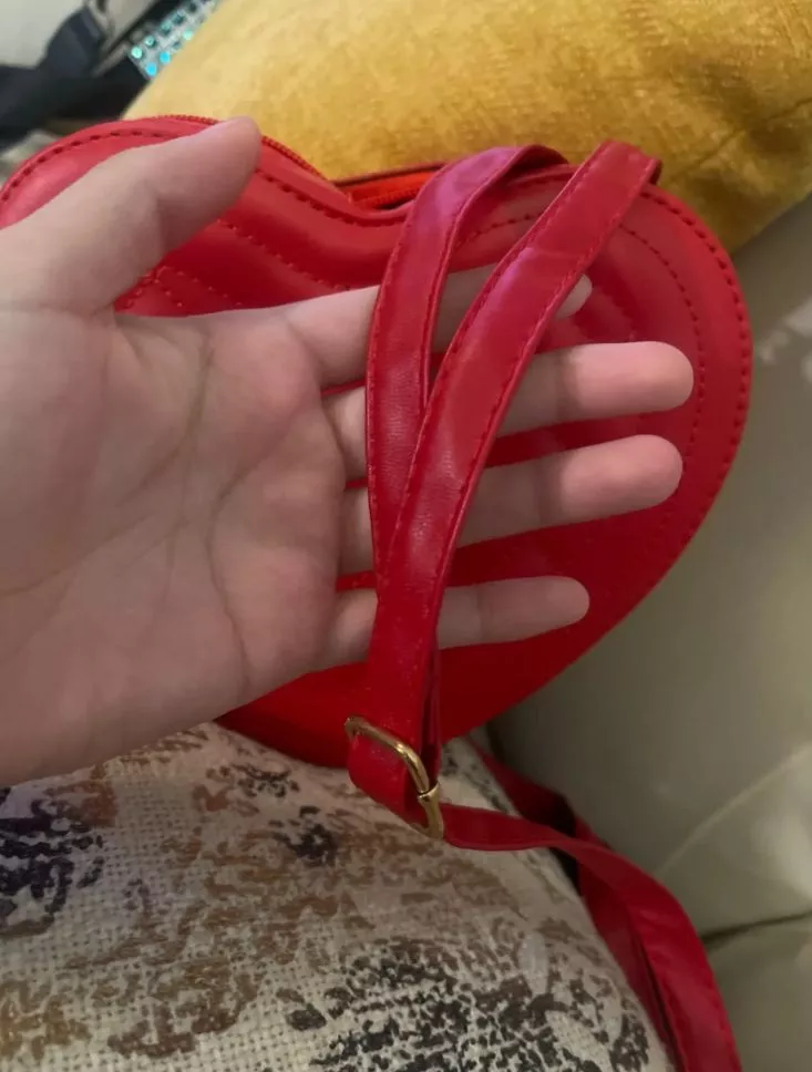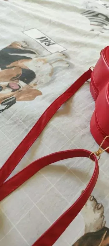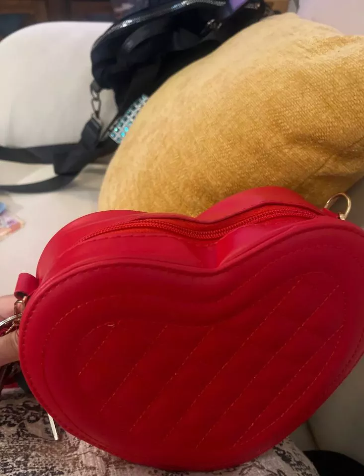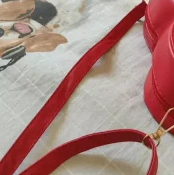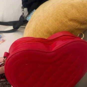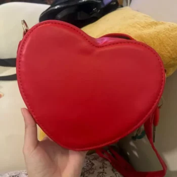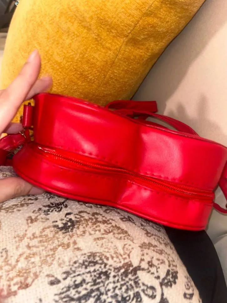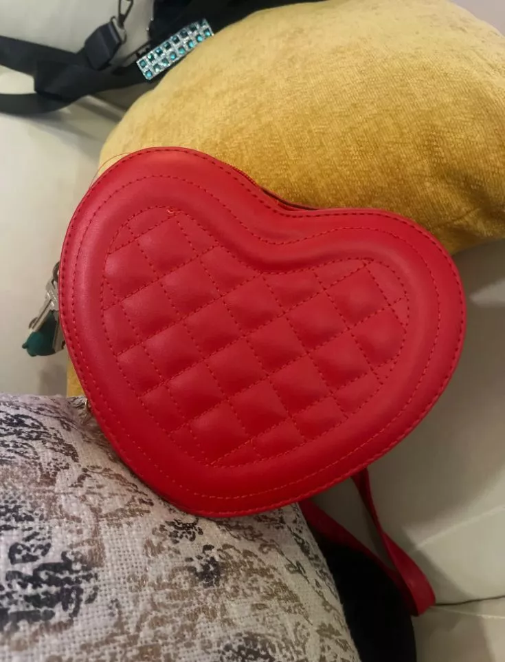 I'm so enamored with this purse that I've bought it twice - once for myself and once for my mother, who also adores it. It's exquisitely made and spacious, with a vibrant red hue. It's an adorable little heart-shaped purse that's well worth the price. I've had fun experimenting with different chains and accessories to make it even more stylish.
