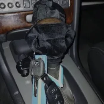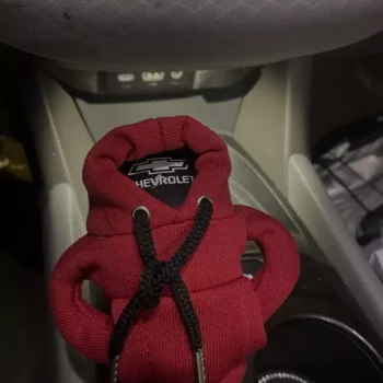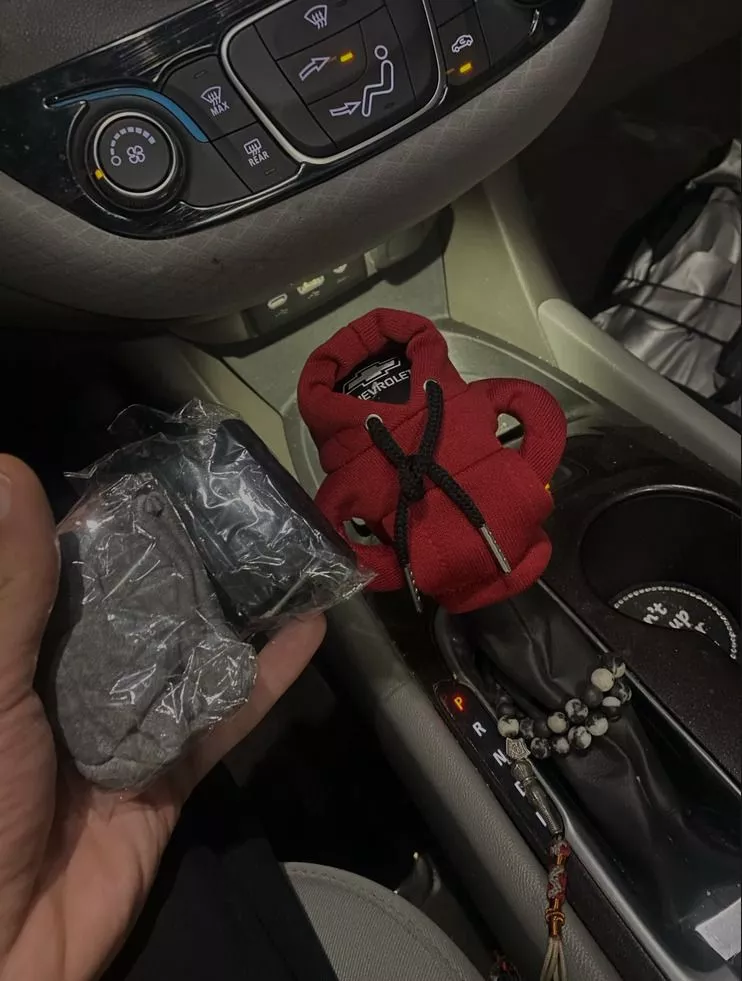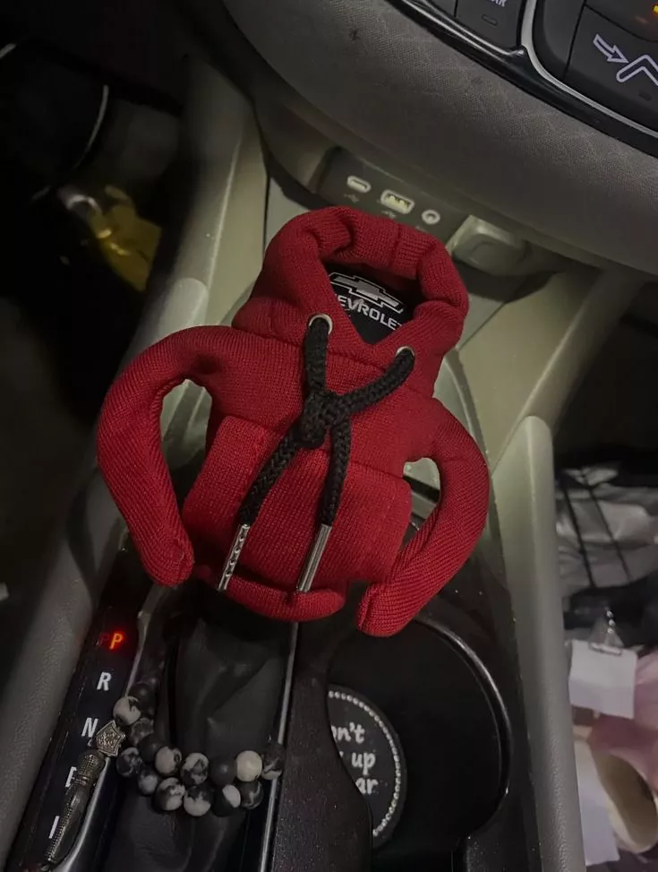 This miniature hoodie fits nicely on the gear shift and has received many compliments.