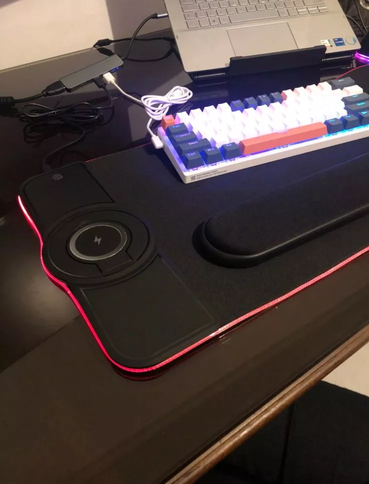 This is my first desk pad, as I usually use mousepads. I'm really happy with this purchase because it accommodates my full-size keyboard and still leaves plenty of room for my mouse. The quality is good, and my mouse moves smoothly on its surface. The RGB lights and wireless charging work well, though it's worth noting that the charging speed is 15 watts, so it's not super-fast.