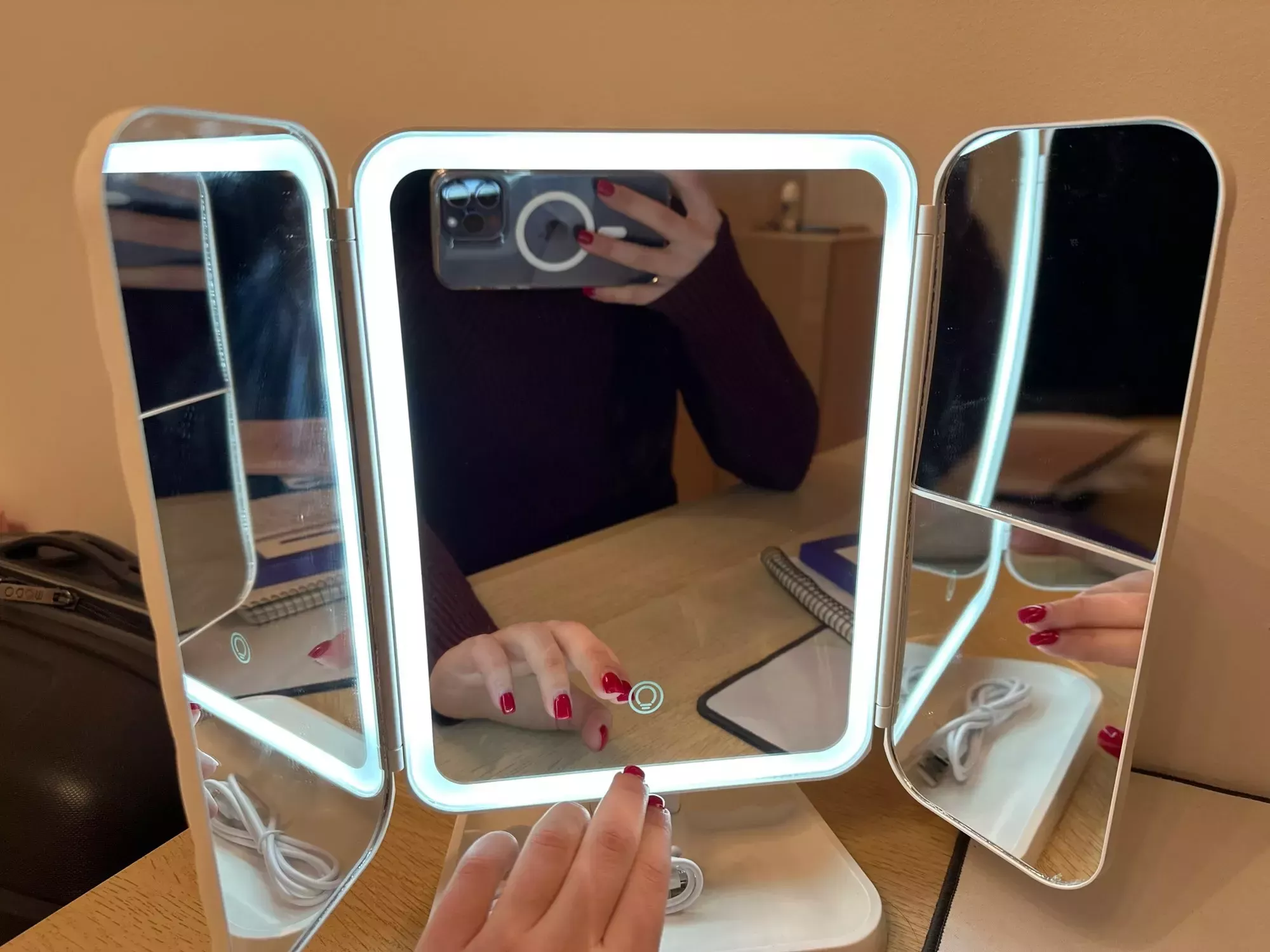 Absolutely adore this mirror with its lighting features. It comes with a durable internal battery, a charging cable, and offers three types of lighting: intense cold white, strong warm light, and a softer cold light.