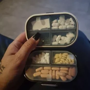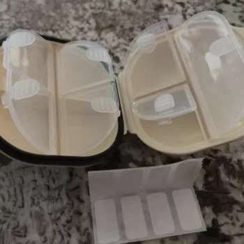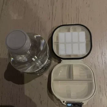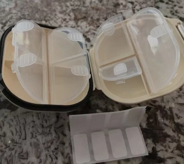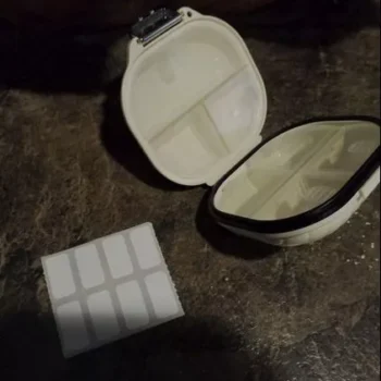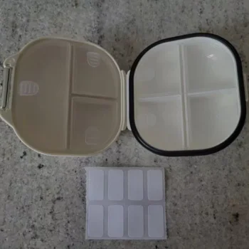 I have a genuine fondness for this travel pill organizer because of its compact size and generous storage capacity. It accommodates vitamins, gum, pills, and more securely, fitting comfortably in a pocket or bag.